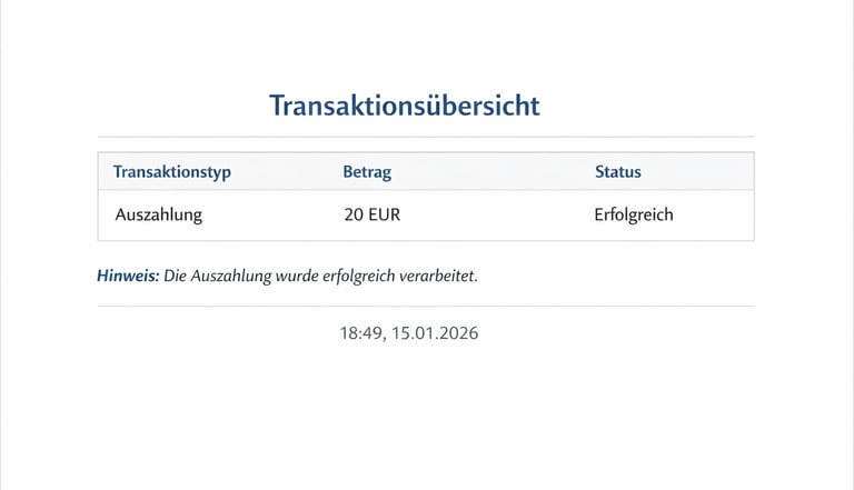Nach dem Ausfüllen des Formulars erhalten Sie eine E-Mail mit detaillierten Informationen für die Überweisung. Bitte beachten Sie, dass Überweisungen über das SEPA-System 1 bis 3 Werktage in Anspruch nehmen können. Nach Abschluss dieses Prozesses wird das Geld auf Ihr Konto gutgeschrieben.
